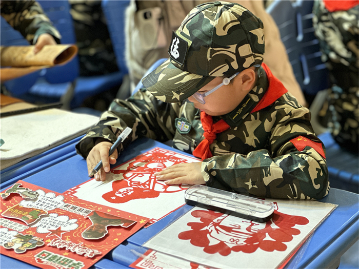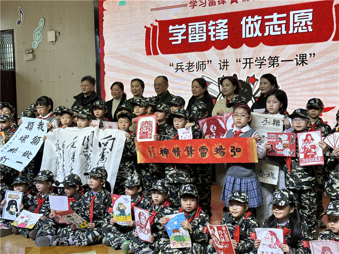 课堂里,孩子们也表达着各自的理解。“学习雷锋其实很简单,比如平时主动帮助老师同学。”二年级学生丁若欣分享道。同时,他们还用剪纸、贴画、书法及毛毡复刻军绿色的“雷锋包”等形式,展示自己创作的雷锋叔叔“周边”。