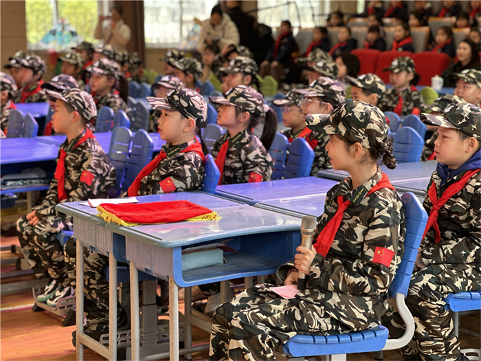 3月4日是新学期报到日,怀德苑小学香江校区的多媒体教室里,身穿迷彩服、戴上小军帽的同学们,聆听一位特别的“兵老师”来讲“开学第一课”。