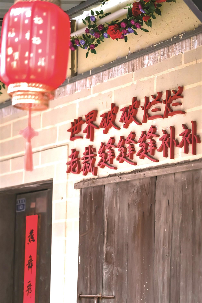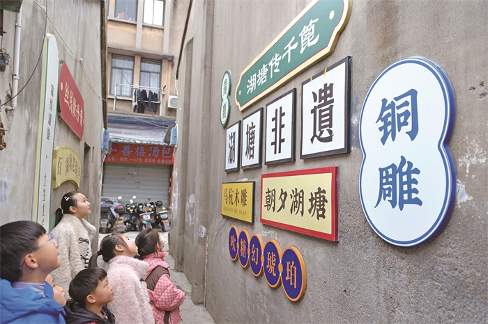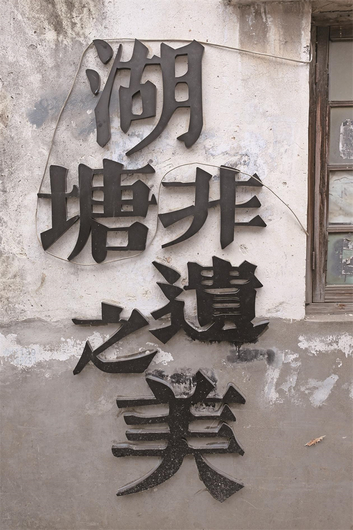 看不见的里子同样被扎牢。路面翻新时,原有老石料被优先利用,复刻旧时肌理;檐角添了仿古装饰,重现温润线条;三线入地、管网重排,彻底解决了积水之困。居民樊荷英指着脚下:“下水道、管道都安装在外面,抄表方便,路面再也不淹了。”墙上嵌入“湖塘非遗”“留青竹刻”等字样,新增的小品镌刻着老街由来与时光印记。
