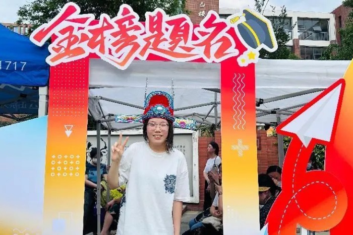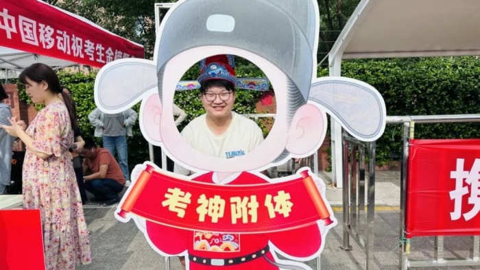 “金榜题名”打卡拍照点成为现场一大亮点。印有富强村logo的水墨风小扇子、喜庆的状元帽,搭配印着“金榜题名”祝福标语,有不少家长与孩子拍摄“亲子应援照”,一张张照片定格希望,传递着满满的祝福。