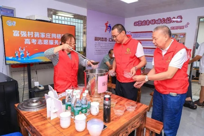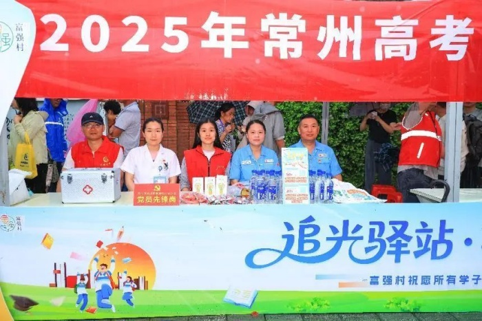 富强村党总支联合辖区爱心企业、茶山街道卫生服务中心,共同打造的高考党员志愿服务点,成为考场外最热闹的“能量补给站”。这也是富强村在常州市田家炳高级中学考点设立高考党员志愿服务点的第7个年头。