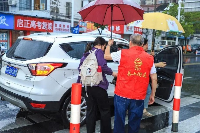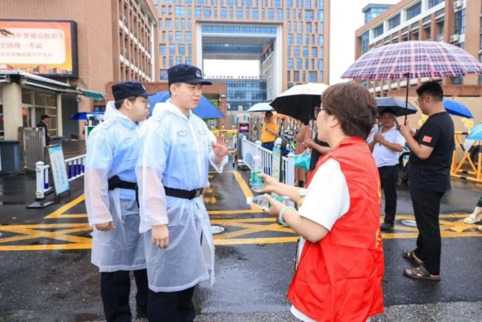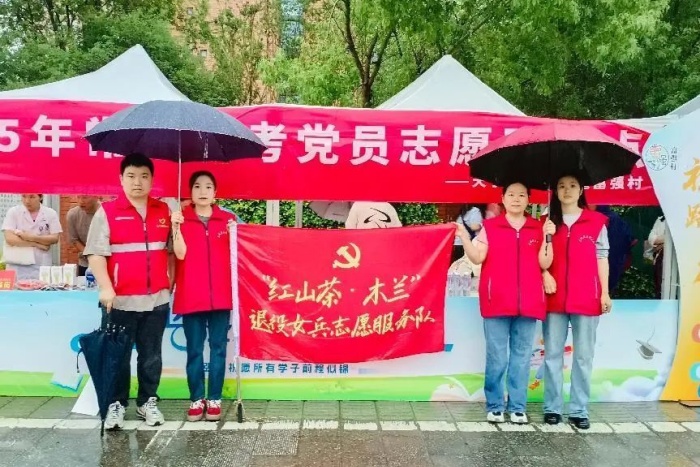 党员志愿者们以贴心服务贯穿高考全程。高考当天,暴雨倾盆而下,但恶劣天气丝毫没有阻挡志愿者们的热情。清晨,他们冒雨为家长递上一瓶瓶矿泉水;当看到有考生到达考点时,志愿者们毫不犹豫冲进雨中,在积水的道路上、为孩子们撑起爱心雨伞;面对各类咨询,他们耐心解答,声音在风雨中依然坚定。