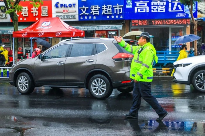 属地交警中队迅速行动,在考点附近提前部署。暴雨导致部分路段积水严重,交警们坚守岗位,疏导交通、指挥车辆有序停放,并对周边道路实施临时交通管制,有效避免交通拥堵。他们在风雨中坚定的手势、湿透的制服,为考生开辟出一条畅通无阻的赴考之路,确保每位考生都能按时、顺利抵达考场。