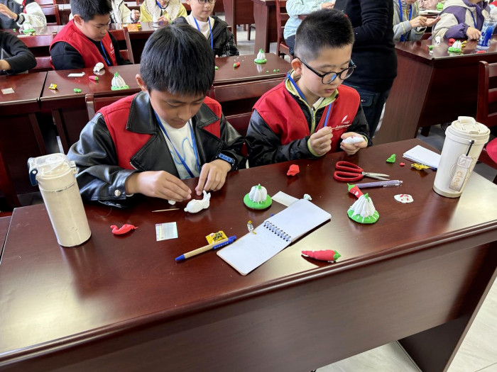 活动将泥塑技艺与传统文化教育相结合,通过专业泥塑艺人志愿者现场讲解泥塑历史渊源、地域特色及制作工艺,学生系统地了解了泥塑作为国家级非物质文化遗产的深厚底蕴。实践环节中,在艺人“手把手”指导下,学生掌握揉、捏、搓、刻等12项基础技法,独立完成动物、人物等主题作品20余件。在“小组共创”环节中,学生们被分成5人一组,共同协作完成大型主题泥塑作品。在这个过程中,学生们充分发挥了自己的优势和特长,同时也学会了倾听他人的意见和建议,他们自发形成了分工协作机制,有效提高了沟通效率。
