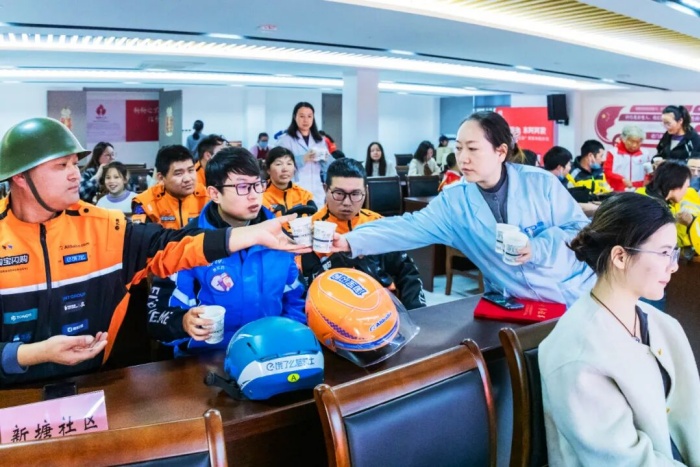 你为城市送便利,城市为你送安康。11月16日,“健康相伴 暖新同行”关爱活动在金坛区东城街道新塘社区温情启幕,政社企多方携手,将健康与暖心关怀送到外卖快递骑手身边。