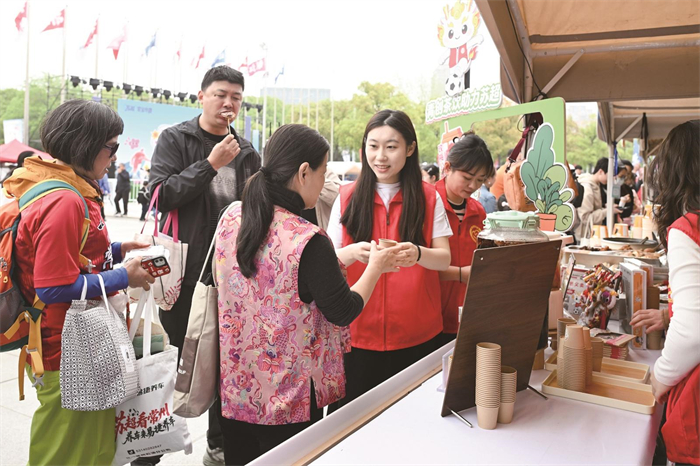 作为“苏超”揭幕战的配套特色活动,场外主题集市深度融合体育激情与市井烟火。在奥体中心主场馆入口旁,志愿暖心公益茶饮摊位前人头攒动。这是天福志愿服务中心第二年参加“苏超”活动。“玫梅公益茶和益心春甘饮,是我们自创的配方,随着气温逐渐升高,我们还会根据时令调整茶饮的品种和配方,争取让球迷游客拥有更加舒适的观赛体验。”志愿者李欣谕介绍,此次提供服务的“青橙一杯”茶饮创业项目由宝妈和大学生创业者组成,“我们希望将志愿初心、创业力量与赛事氛围深度融合,共同传递城市向上向善的力量。”