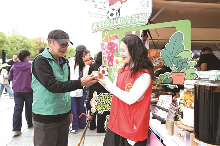 作为“苏超”揭幕战的配套特色活动,场外主题集市深度融合体育激情与市井烟火。在奥体中心主场馆入口旁,志愿暖心公益茶饮摊位前人头攒动。这是天福志愿服务中心第二年参加“苏超”活动。“玫梅公益茶和益心春甘饮,是我们自创的配方,随着气温逐渐升高,我们还会根据时令调整茶饮的品种和配方,争取让球迷游客拥有更加舒适的观赛体验。”志愿者李欣谕介绍,此次提供服务的“青橙一杯”茶饮创业项目由宝妈和大学生创业者组成。