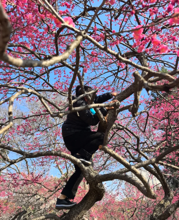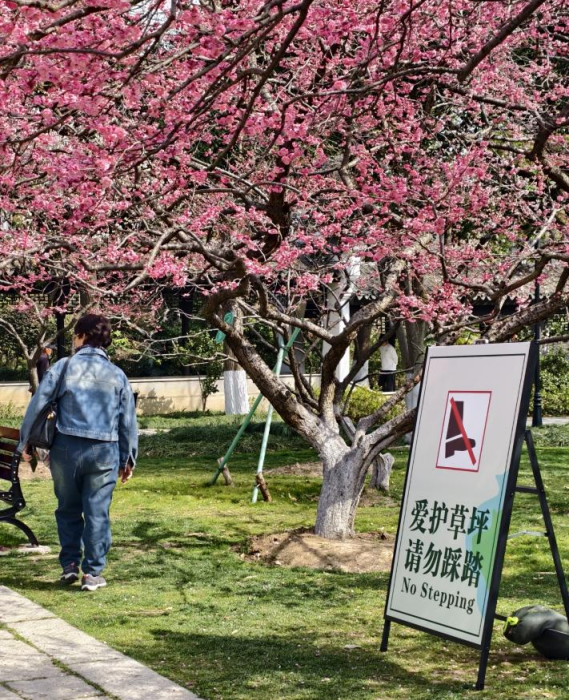 然而,热闹之余也出现了一些不和谐的画面。个别游客为“出片”,执意踩踏草坪、攀爬梅花树,即便在保安和周围游客的劝阻下依然我行我素。