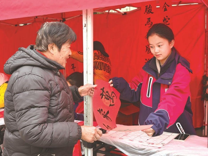 2月5日上午,五星街道商会副会长单位大润发勤业店联合勤业中学,共同开展义写春联志愿服务活动。11名勤业中学的书法特长生挥毫泼墨,一批寓意勤廉的春联送到了往来市民手中。现场还设有反诈宣传、政策咨询、血压血糖检测等多个便民服务点位。(刘科羽 花晨凯 图文报道)