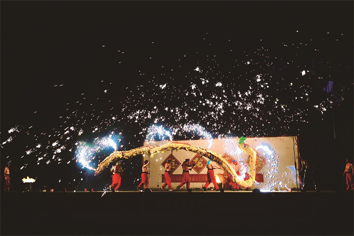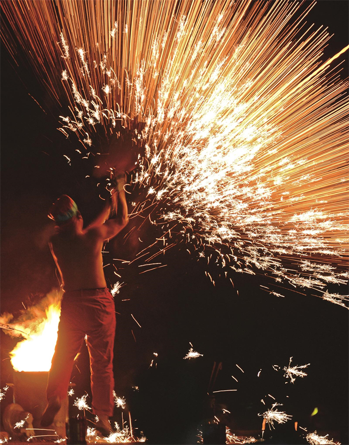 3月2日(正月十四)晚8时许,金坛区直溪镇巨村龙会活动迎来最精彩的环节——铁水火龙。旺盛的火苗将铁水烧得通红,直溪巨龙队的队员们随即“光膀上阵”,一勺铁水、一下击拍……超1000℃的铁水瞬间在空中四散开来,绽放成美丽的铁花雨。