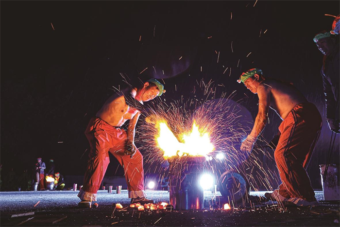 今年的巨村龙会活动从3月2日一早就热闹开启,包括民俗巡游、舞龙展示、文体节目表演等环节,铁水火龙成为其中最吸引人的环节。欧阳卫星介绍,烧铁水是个技术活,要掌握火候,更要讲究配合;铁水抛得越高,形成的铁花就会散得越开,视觉效果越壮观,掉落时也不容易伤到人。